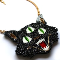 The cat measures 10cm wide and 8cm high so it's fairly big. The necklace is created from laser cut perspex and hing on either a silver or gold plated chain or cord.